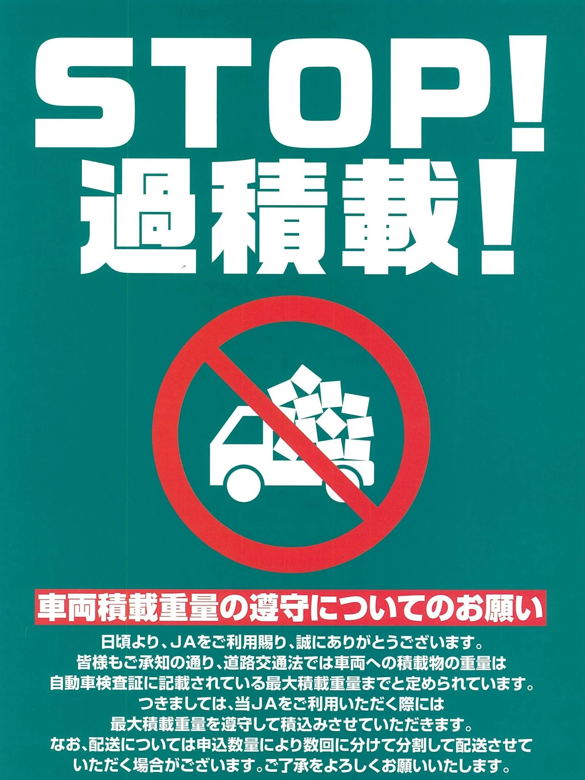 道路交通法では車両への積載物は自動車検査証に記載されている最大積載重量までと定められています。最大積載重量を遵守してのご利用をお願いします。